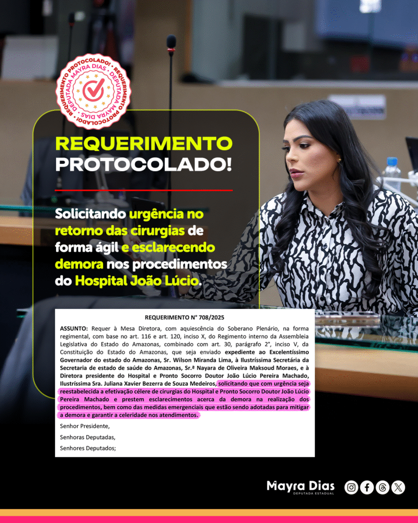 Após receber inúmeras denúncias sobre a grande demora para a realização de cirurgias no hospital e pronto-socorro Doutor João Lúcio, além de condições precárias em que estão os pacientes internados na unidade e sem previsão de atendimento, a deputada Mayra Dias protocolizou um requerimento cobrando respostas e ações imediatas do Governo do Estado e da […]